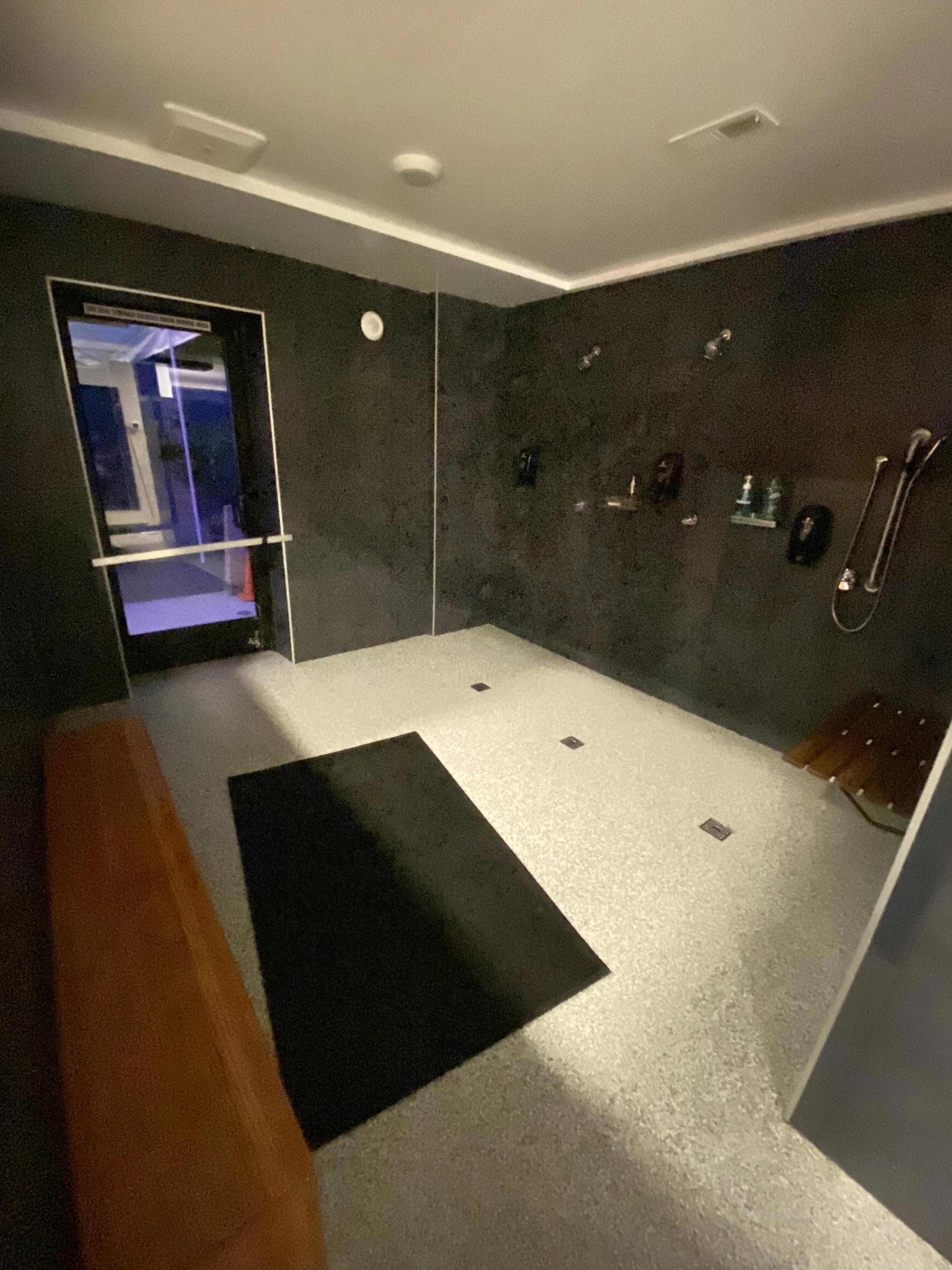 Downstairs features benches and towel hooks, while the upstairs shower is watersports-friendly. The patio shower is perfect for a quick rinse between the sauna and hot tub.