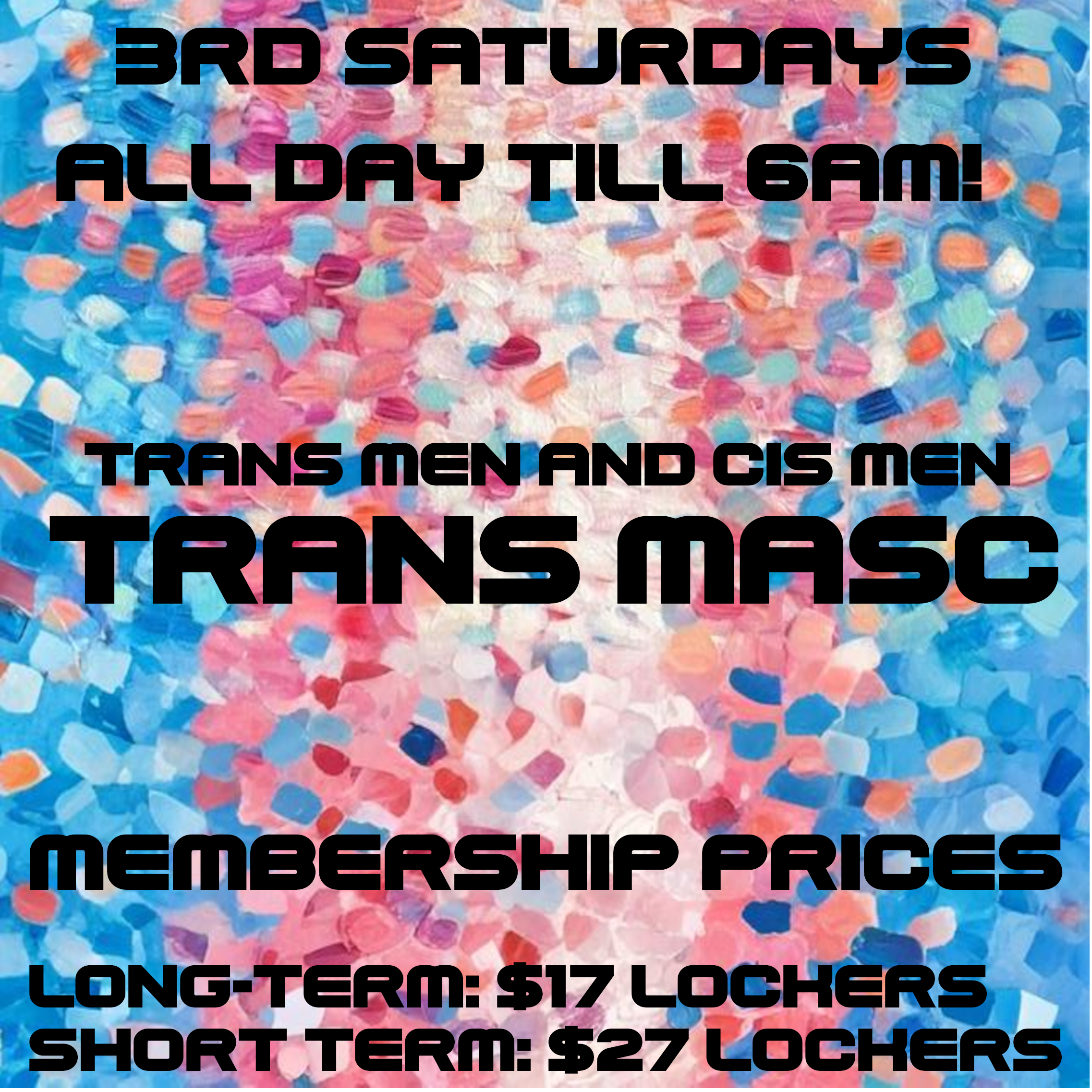 From the jacuzzi to the sauna to the upstairs play spaces, Trans Masc is your time to stretch out, connect, and explore without pressure or judgment. Bring your friends, your curiosity, and your full self.